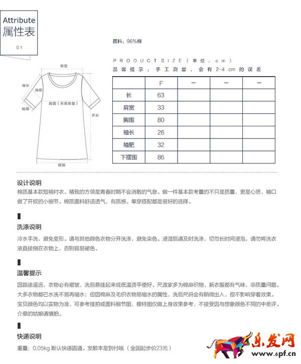 產(chǎn)品屬性的展示:比如面料、質(zhì)地、顏色、重量、洗滌建議、尺寸表等等。我知道很多人看到這里會說我也不知道啊,我當(dāng)初也遇到到這個情況。給自己找個借口很簡單,但往往就是這些難處成為你和別人拉開距離的根本所在。你可以去問、去學(xué)、去百度,如果你自己都不了解自己的寶貝,你憑什么讓別人也認(rèn)為這是個好東西?