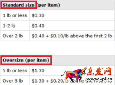 (3)亞馬遜合倉收取費用,以美國站為例,包裹收取的費用與重量個尺寸大小有關采用按件收費的形式。標準尺寸重量在1 磅一下的收取0.3 美金,大尺寸重量在5磅一下的收取1.3 美金。具體情況看下圖。