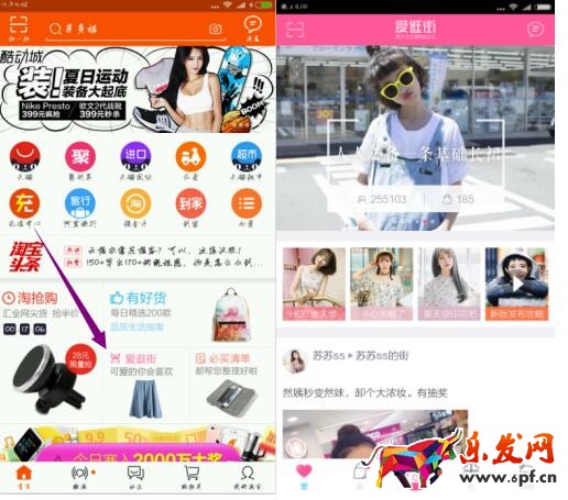 我們打開手機淘寶APP 在首頁中部的位置有好貨下面我們可以看到愛逛街的版塊(上左圖)然后點擊進去就直接進入愛逛街的手機端了(下圖左)