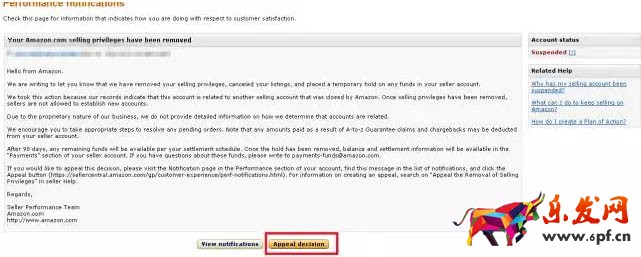 1)賣家可登錄賣家后臺https://sellercentral.amazon.com/gp/customer-experience/perf-notifications.html,點擊績效提醒Performance Notifications,找到亞馬遜通知帳戶被封的那封郵件,點擊“Appeal decision”申訴按鈕,將準備好的申訴內容寫入,寫好入再提交郵件。