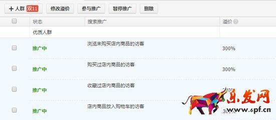 (1)優質人群:全部設置高溢價;加購、收藏、已買到寶貝的人群設為最高溢價;領取店鋪優惠券或紅包的訪客;購買過本店商品的訪客。出高溢價(建議100%)。