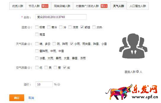 (3)天氣人群(全部打開):同樣逐個添加項目;同樣采用上坡法、下坡法。溢價10%-50%
