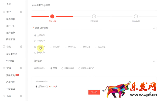 在設(shè)置活動(dòng)名稱的時(shí)候,如果是針對(duì)興趣用戶的可以設(shè)為新人尊享特惠,如果是針對(duì)老客戶的,可以設(shè)為VIP專屬優(yōu)惠。活動(dòng)的時(shí)間最好設(shè)置為1天或者3天以內(nèi),以增加客戶的緊迫感。選擇商品時(shí)要避開(kāi)正在參加活動(dòng)的寶貝,這樣才不會(huì)給店鋪造成不必要的損失。