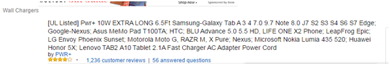 優(yōu)化亞馬遜標(biāo)題和優(yōu)化谷歌標(biāo)題不一樣。谷歌是盡量標(biāo)題簡潔,關(guān)鍵詞靠前。而亞馬遜你只要關(guān)心關(guān)鍵詞就行,可以在80個(gè)字符里盡情地塞下關(guān)鍵詞。超過80個(gè)字符也沒關(guān)系,關(guān)鍵詞過多總比太少好。比如下面這個(gè)最受歡迎的Nexus charger產(chǎn)品標(biāo)題就非常長: