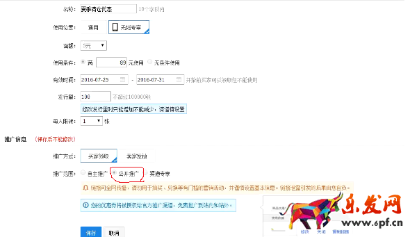 我們要設置無線端優惠券的前提是我們要在PC端把無線端的優惠券設置好后才能去無線端進行設置,在這里需要注意的是,如果要在無線端設置優惠券的話,必須要在PC端的推廣范圍處設置公開推廣,否則是無法再無線端設置優惠券的。