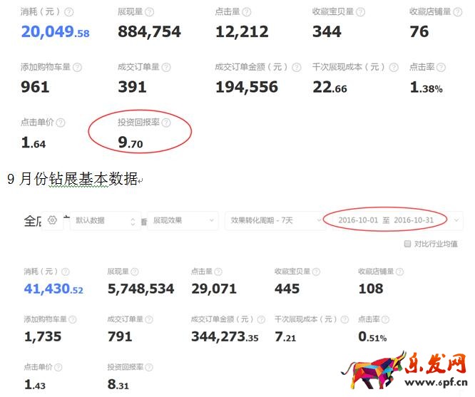 落實到最后截取了9、10月份的整體賬戶數據,來看一下經過上面的投放落地數據是怎么樣的一個情況。為什么沒有截取11月份的呢,是因為11月份中的雙十一的購買力會有明顯的爆發對店鋪的數據支撐是有很大幫助的,不能很客觀的說明以上想法的可行性。
