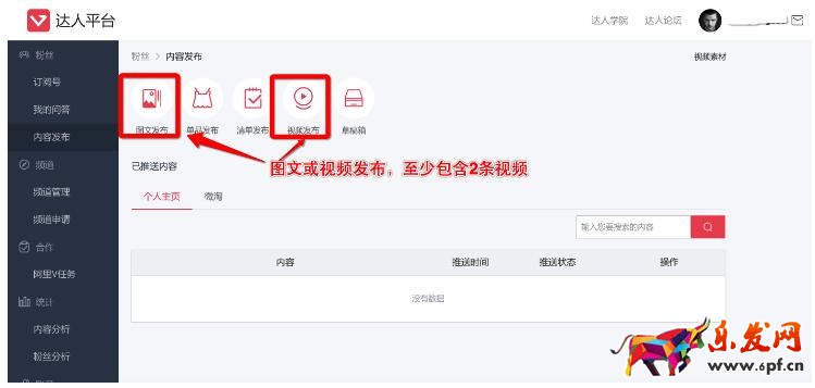 第二步:左側導航欄找到“內容發(fā)布”,選擇發(fā)布5條圖文和視頻類型(內容要求如上文)
