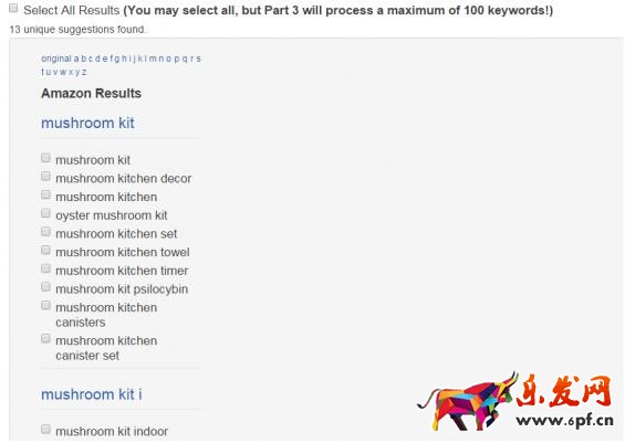 (2)選擇了所有結果后,點擊“Run Part 2: Bulk Suggest”按鈕,該工具就會運行所有來自亞馬遜搜索框的關鍵詞建議,這時賣家就可以獲得更具體的自動建議關鍵詞組。第一步生成了13個結果,而第2步生產了6個結果,合起來總共19條關鍵詞。