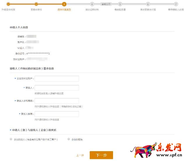 現(xiàn)在開(kāi)始選擇關(guān)系類型,先是申請(qǐng)人的個(gè)人信息,然后填寫接收人(升級(jí)后的店鋪主體)基本信息,填上企業(yè)支付寶賬戶,還有聯(lián)系人及其手機(jī)號(hào)碼跟郵箱,最好選擇申請(qǐng)人跟接收人(也就是企業(yè))的關(guān)系,然后進(jìn)入下一步。