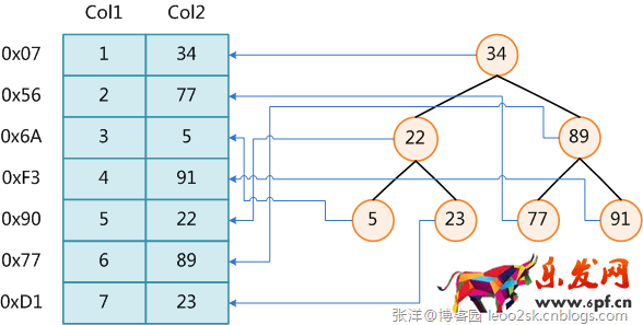 上圖展示了一種可能的索引方式。左邊是數據表,一共有兩列七條記錄,最左邊的是數據記錄的物理地址(注意邏輯上相鄰的記錄在磁盤上也并不是一定物理相鄰的)。為了加快Col2的查找,可以維護一個右邊所示的二叉查找樹,每個節點分別包含索引鍵值和一個指向對應數據記錄物理地址的指針,這樣就可以運用二叉查找在O(log2n)的復雜度內獲取到相應數據。