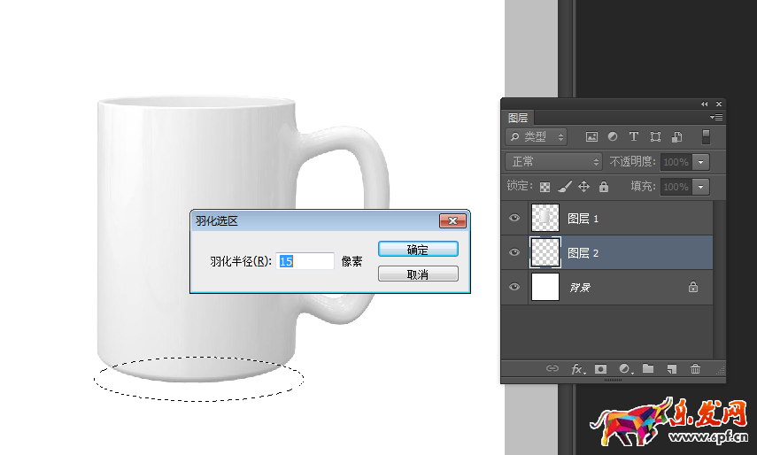 然后,選擇橢圓框選工具,在圖層1杯子的底部,沿這邊緣繪制出一個橢圓形