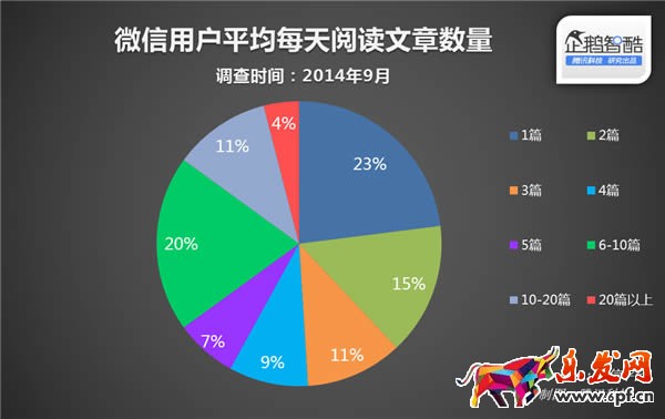 5.86篇是一個平均數,不同的用戶每天閱讀的文章數存在挺大差異。從圖表中可看出,23%的用戶平均每天只閱讀1篇文章,但也有20%的用戶每天閱讀6篇到10篇。日均閱讀文章數超過3篇的用戶占比51%,閱讀3篇以下的用戶也占到了49%。這意味著重度閱讀用戶愿意在上面花更多時間看文章,但也有部分用戶可能并不會花過多時間在上面閱讀。5@!mV~[Y