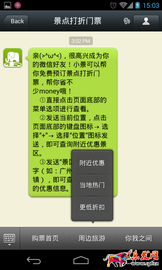 pV2cK5n#J4hl0景點打折門票(微信號:yikuaiqulx)是最早一批上線的微信公眾平臺應用之一。由于我們比較早地進入了微信的公眾平臺,得到了很多的“實惠”。比如微信在做案例分享的時候經常會以景點打折門票作為旅游領域的精品案例去分享。于是我們經常會在后臺看到一大波粉絲關注了我們。hq:uv(]$@3VK