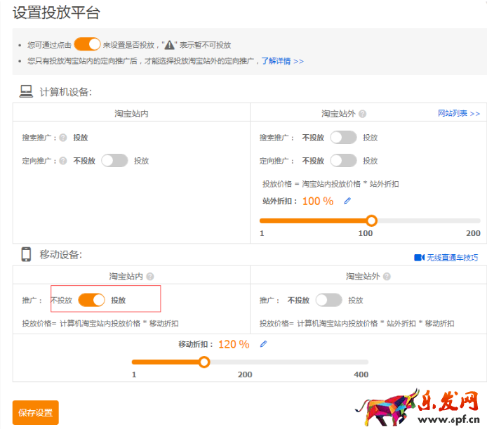 2.設置投放平臺:只投放移動端,關閉PC和站外。