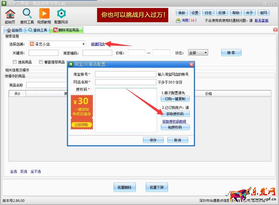 第二步:首次使用請先點擊“新建網店”,登陸店鋪后獲取授權碼配置店鋪。