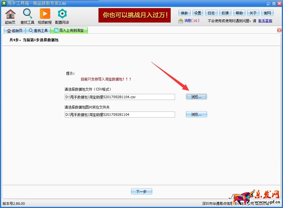 第二步:點擊“瀏覽”選擇需要導入的淘寶數據包(目前僅支持上傳淘寶數據包),然后點擊“下一步”。