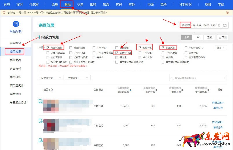 ①有數款寶貝已經上架了一段時間,有了一定的數據積累。這時候去到我們的生意參謀—商品—商品效果中,查看7天或者更長時間的寶貝數據,將轉化率、加車率、收藏率表現都比較好的寶貝定為主推款。這里至少要求寶貝有500訪客以上,否則寶貝表現的數據可能會不精準。