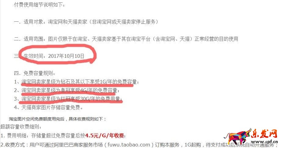 該通知表明從2017年10月10日起,淘寶圖片空間將告別免費(fèi)時(shí)代,新手賣家最多免費(fèi)使用1G/年,對(duì)于存儲(chǔ)量超過免費(fèi)容量的部分將按照4.5元/G/年收費(fèi)。