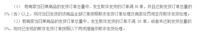 本條款所稱“欺詐發(fā)貨”均指商家當日某商品的發(fā)貨訂單總量中,發(fā)生欺詐發(fā)貨的訂單滿10單,并且達到發(fā)貨訂單總量的1%(含)以上的情形。