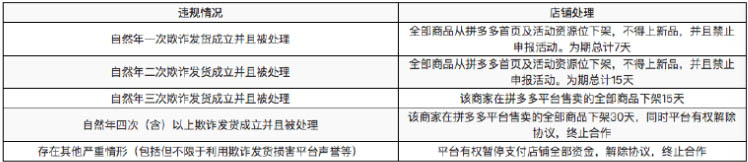 商家在自然年內(nèi)一旦發(fā)生欺詐發(fā)貨,拼多多平臺在對欺詐發(fā)貨訂單進行處理的同時,還有權(quán)對店鋪采取相應的處理措施。具體處理措施如下: