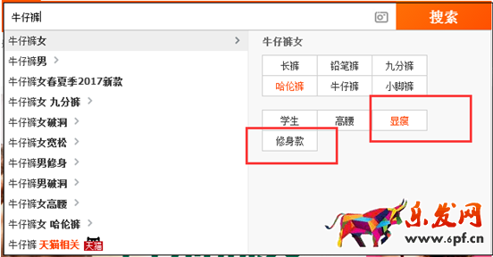 比如搜索牛仔褲女,我們看后面拉出來的二級詞,有長褲、鉛筆褲、哈倫褲、顯瘦、學生、修身款等等。前面的牛仔褲女,這是屬于核心詞,后面的都是修飾詞,但是你一定要注意,恰恰是這些修飾詞,才是真正展現消費者需求利益點的。