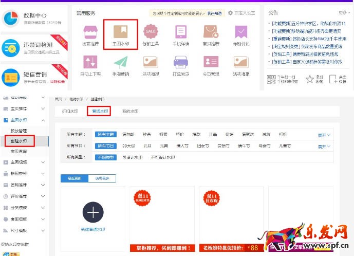 進入超級店長以后,點擊主頁的“主圖水印”(見上圖),接著點擊“創建水印”,選擇“普通水印”,因為普通水印可以自由編輯。根據系統提供的水印模板進行編輯,價格、優惠、雙十二的氛圍標等等,最后添加商品進行投放即可。