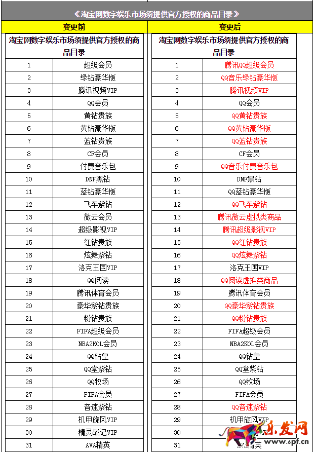 3、《淘寶網數字娛樂市場須提供官方授權的商品目錄》未有增減,僅明確細化商品種類的名稱。