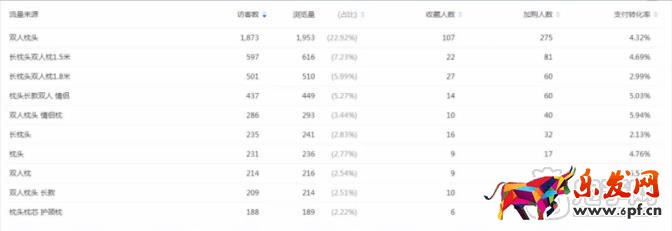接著還要對店鋪的人群進行分析,主要分析他們都是通過什么關鍵詞進來的,這樣能知道他們對寶貝都有哪些需求。如下圖,可以知道大多數買家都是通過關鍵詞雙人枕頭或長枕頭進來的,那么在詳情頁當中可以適當強化這些點的優勢,提升這部分流量的轉化。