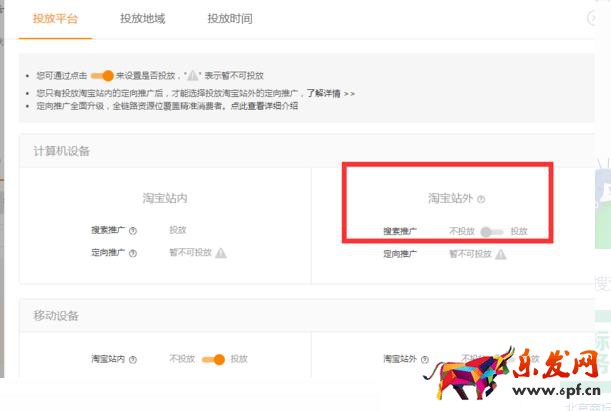 10、在出現的界面中,在“投放平臺”下看到計算機設備,看到“淘寶站內”的搜索推廣默認是“投放”的狀態,并且是無法修改的