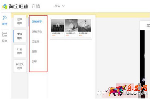 入口:進(jìn)入賣家中心,找到“店鋪裝修”,進(jìn)入淘寶旺鋪后,選擇“詳情頁(yè)裝修-單品-裝修詳情”。進(jìn)到無(wú)線端詳情頁(yè)布局頁(yè)面,在左邊找到營(yíng)銷模塊,將這些模塊添加到無(wú)線端詳情頁(yè)中: