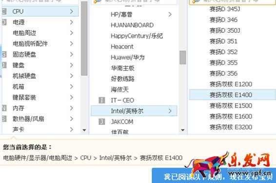 會先跳出商品分類,比如我要發布二手賽揚E1400 CPU,就先選左邊的“電腦硬件/顯示器/電腦周邊”,再接著選“CPU”,再接著選“賽揚E1400”,然后點下面的“我已閱讀以下規則,現在發布寶貝”。
