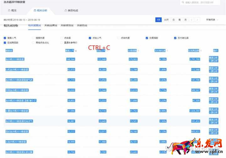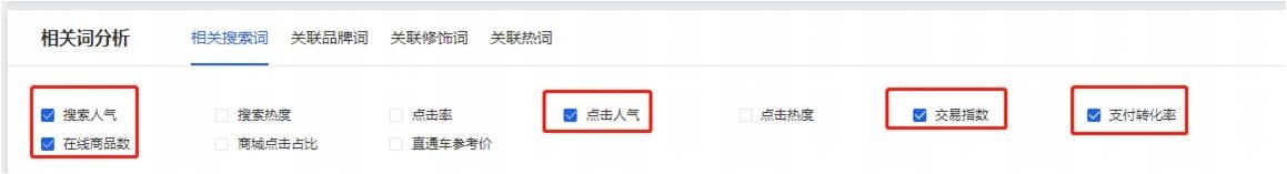 在這個(gè)相關(guān)分析里面記得一定要選這五項(xiàng):搜索人氣、點(diǎn)擊人氣、交易指數(shù)、支付轉(zhuǎn)化率、在線商品數(shù)。