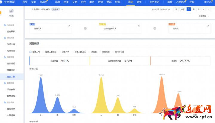 這個可以看到行業搜索的一個人群的分布。現在淘寶的情況大家應該都知道,淘寶現在是越來越注重人群了,對于人群的一個需求,也是我們現在的掌柜商家越來越需要的。