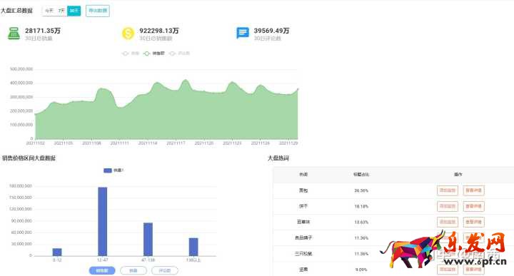 比如說這個關鍵詞下的市場,日單品總銷量、銷售額、 收藏數,以及各個價格區間的銷售額數據都可以看到,根據這些數據可以大致判斷一個市場的好壞,同時也可以去監控這個大盤,天也會自動推送報表給你,這樣你就可以清晰知道自己行業數據的漲幅