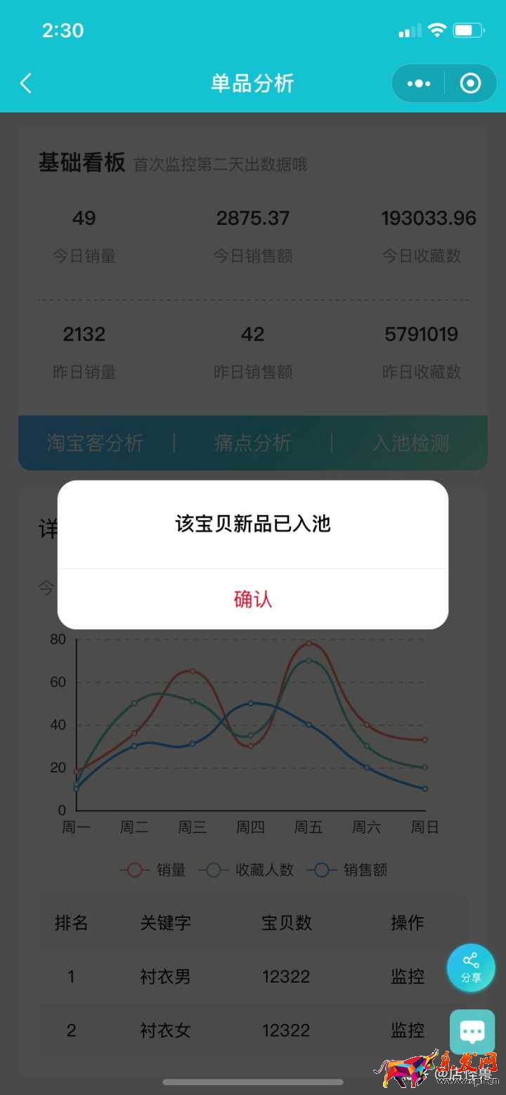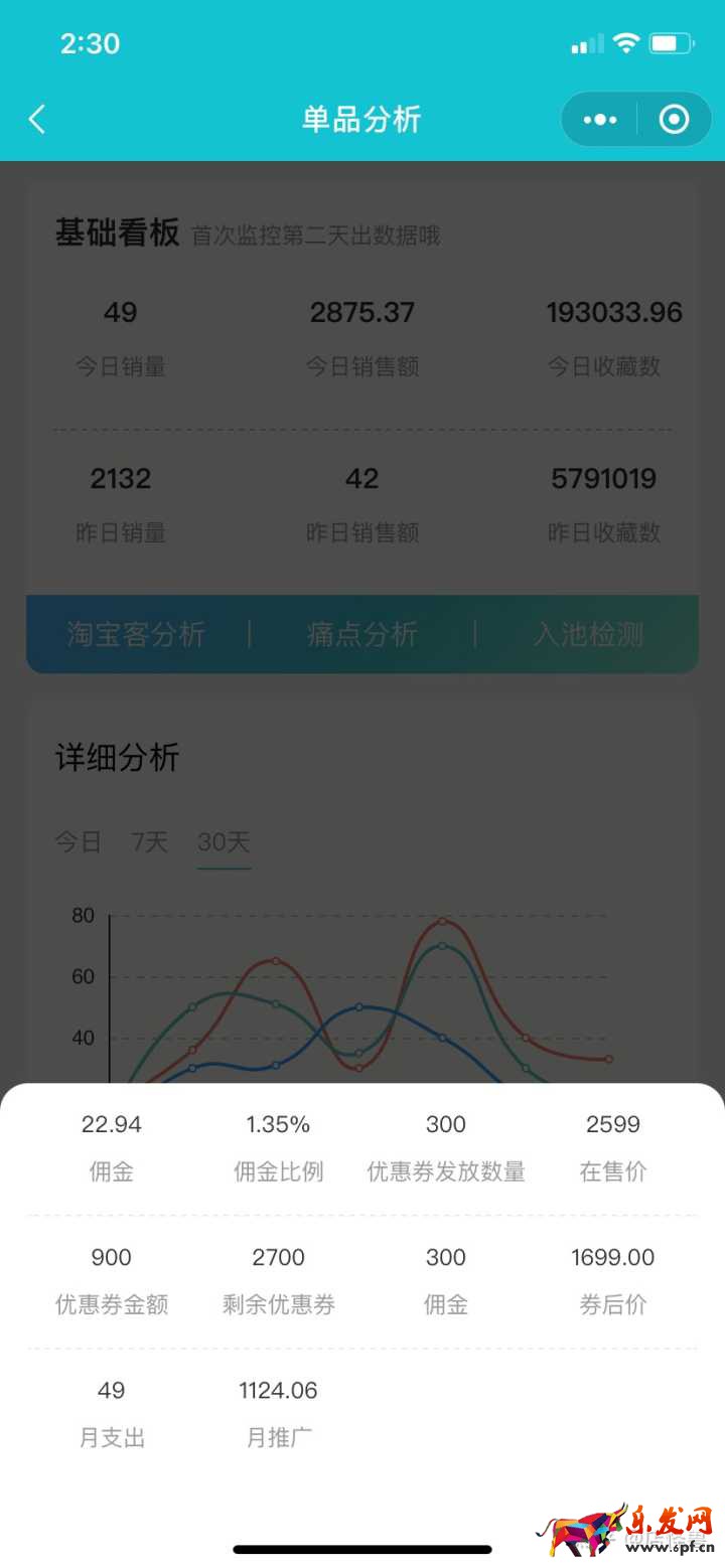 那有小伙伴可能說了,這個是店鋪的數據,有沒有分析單品的詳細數據的,這個還真有。我們輸入單品鏈接之后,可以一鍵查詢出寶貝的多項數據: