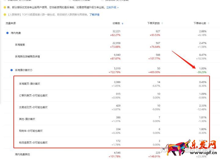 4:最后我們看到店鋪手淘猜你喜歡的流量轉化處于下降狀態,通過端口情況可知道,店鋪現在在超級推薦的推廣上應該是停滯狀態。排名前十的端口看不到此端口,但是目前的淘寶商家應該都很清楚,超級推薦是目前很重要的一個端口。