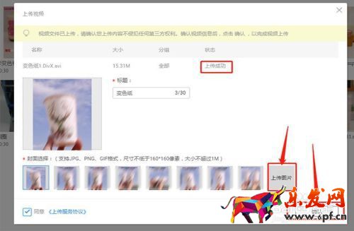 8、上傳成功后,下面會(huì)出現(xiàn)很多視頻圖片,可以選擇一個(gè)圖片為封面,也可以點(diǎn)擊【上傳圖片】來(lái)上傳一個(gè)新的圖片為視頻封面。