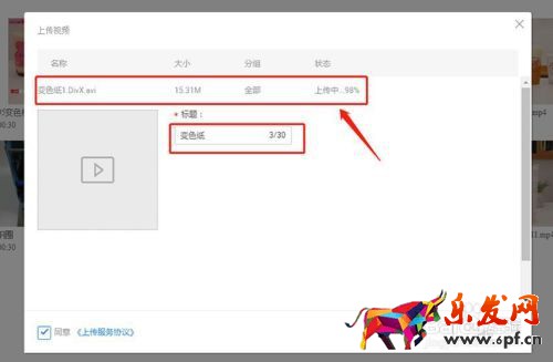 7、上傳視頻對(duì)話框會(huì)顯示上傳名稱、大小、分組、狀態(tài),可以實(shí)時(shí)看到上傳進(jìn)度。