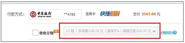 中國銀行淘寶分期付款手續費:3期2%,6期3%,9期4%,12期5%;
