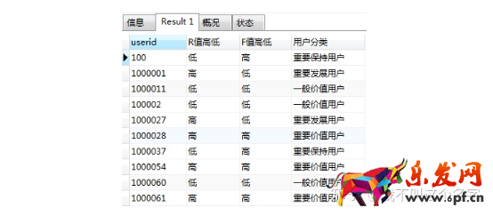 因?yàn)槲覀冞@里僅考慮R、F因素,把R、F值都低的用戶定義為一般價(jià)值用戶,因此按下面用戶分類規(guī)則進(jìn)行分類: