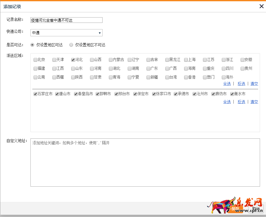 三、自定義設(shè)置快遞不可達地區(qū),如:河北全省中通不可達。