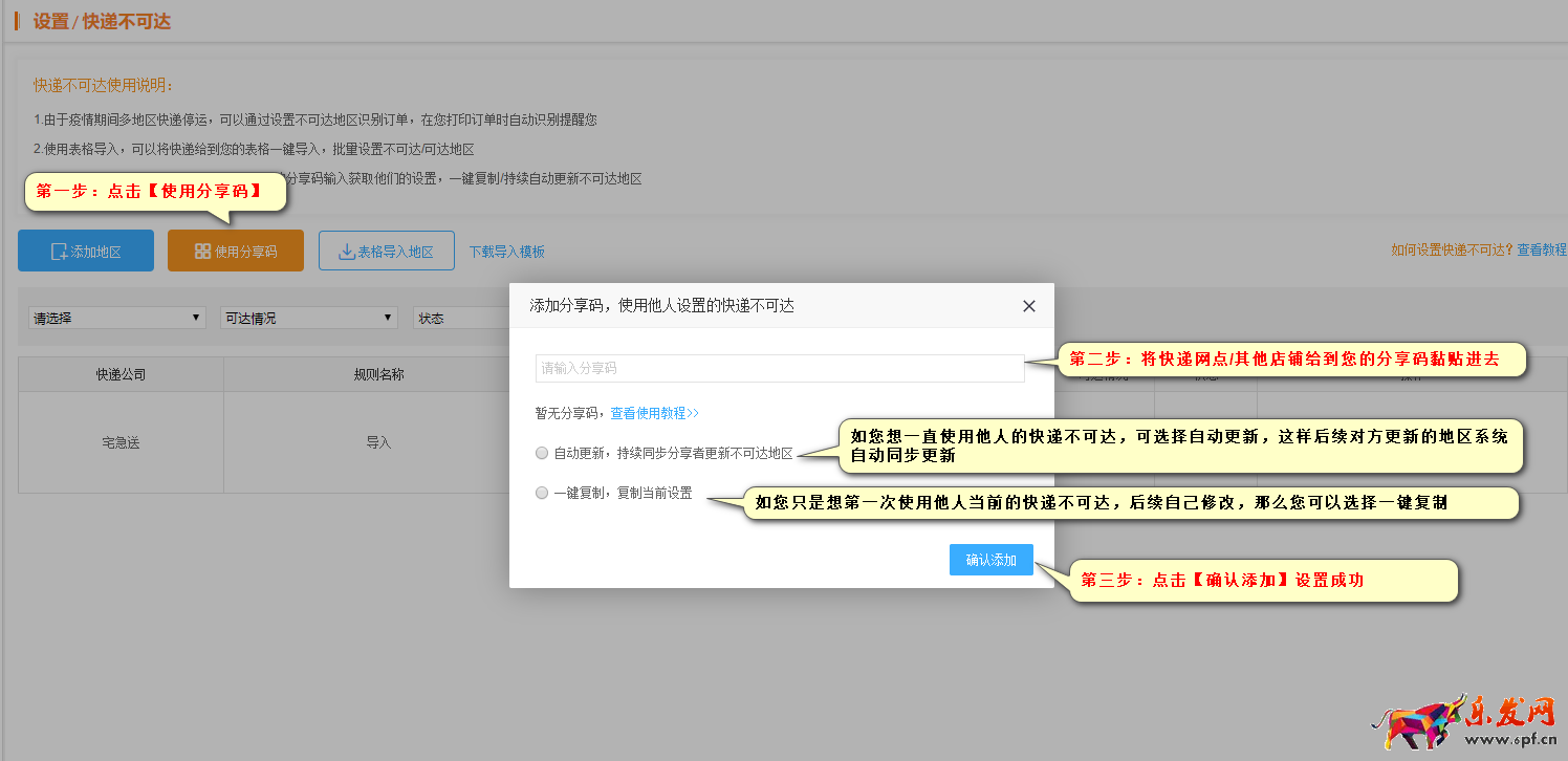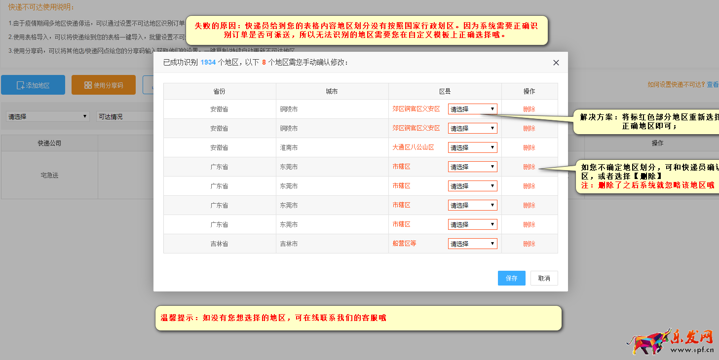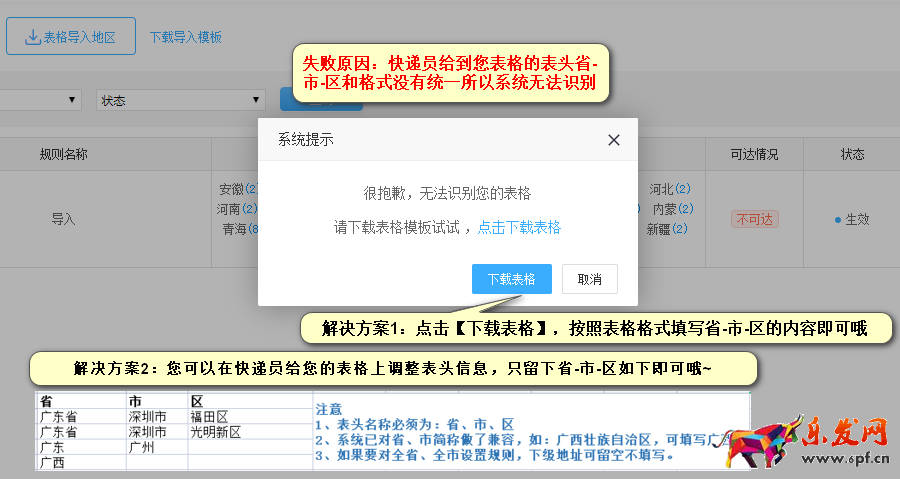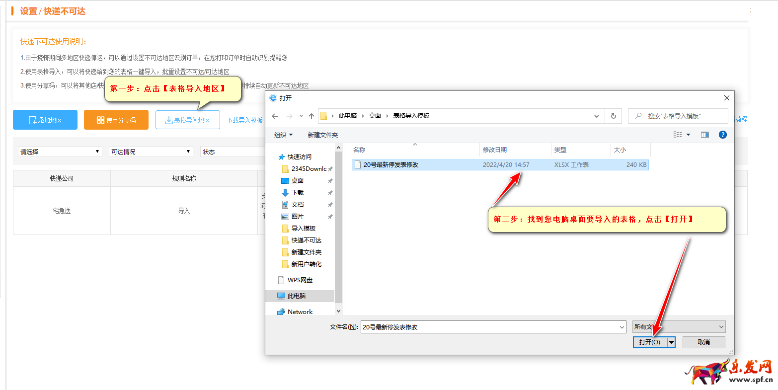 如果快遞給出的停發(fā)地區(qū)是表格形式的,那么就可以使用表格導(dǎo)入方法,完成批量導(dǎo)入不可達(dá)地區(qū)