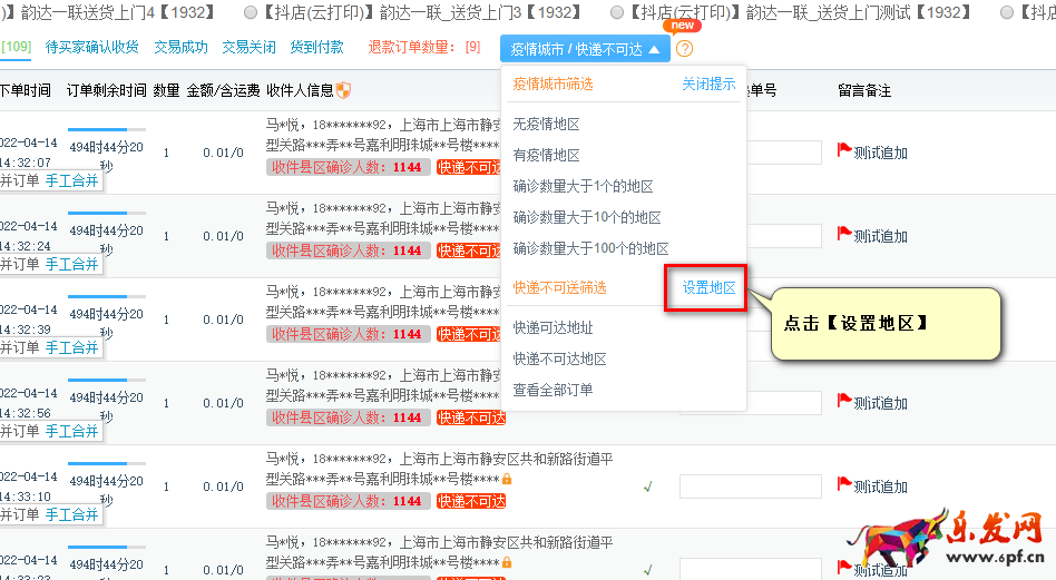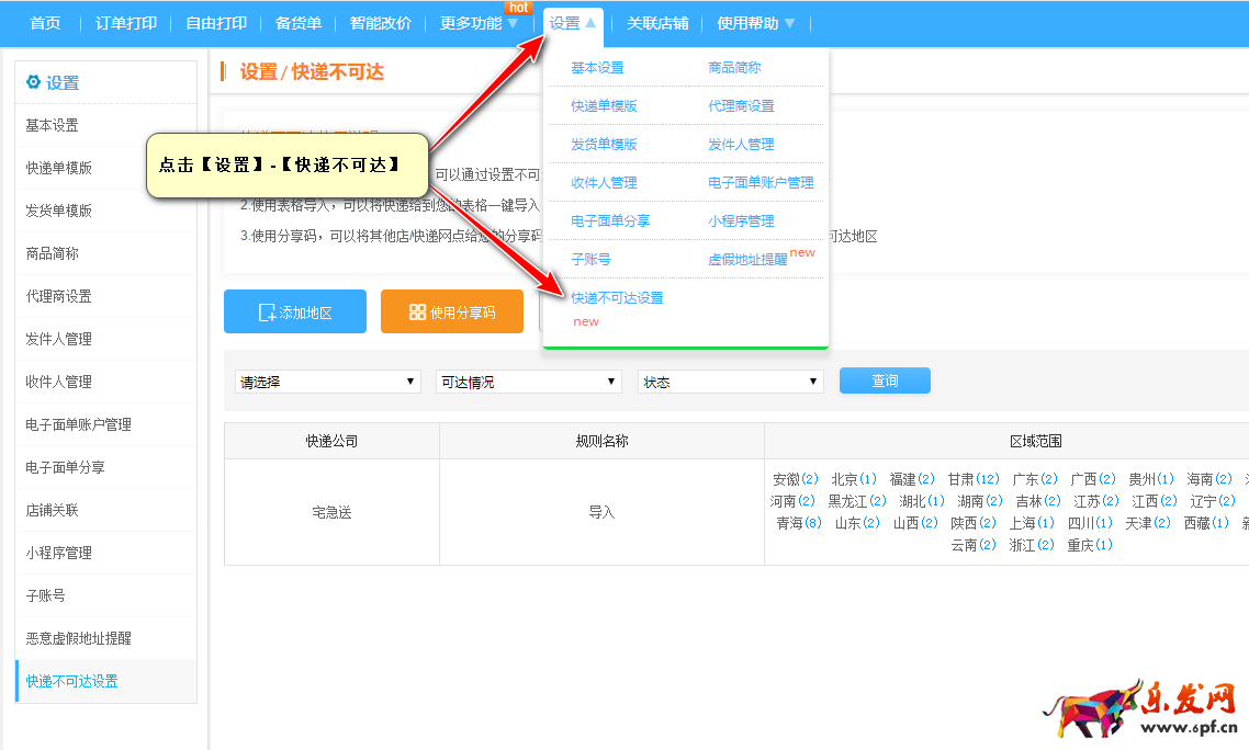 入口一: 進(jìn)入打單系統(tǒng)點(diǎn)擊》》【快遞不可達(dá)】-【設(shè)置地區(qū)】