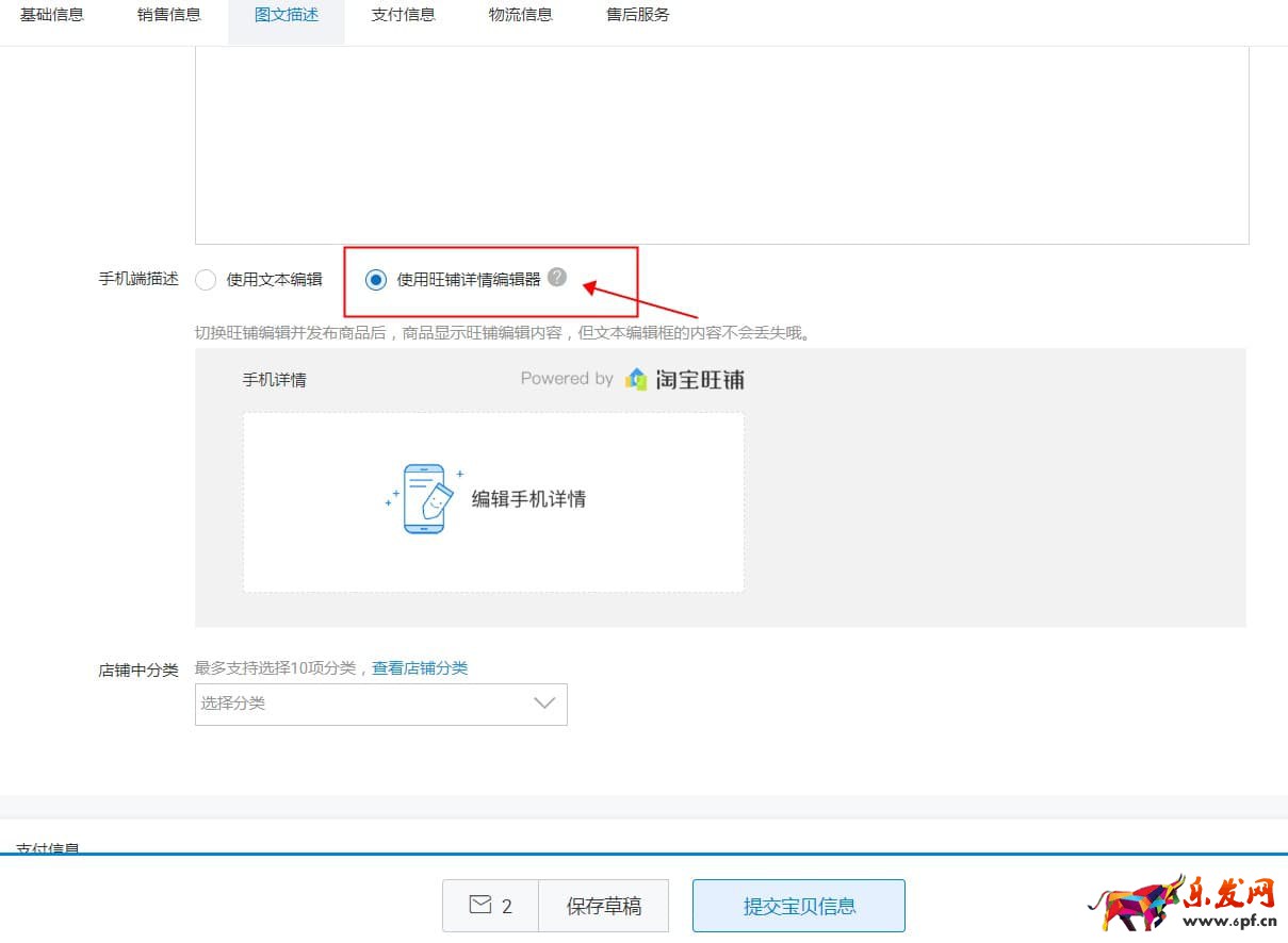 若您希望在手機端描述中設置超鏈接,可以不單獨設置手機端詳情(包括不導入電腦端詳情)手機端詳情直接空白發布;或者需要您切換至“使用旺鋪詳情編輯器”,使用熱區功能進行設置超鏈。