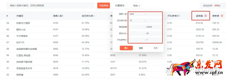 第四步:按照這樣的方式篩選后,就會得到一個符合條件的關鍵詞列表,接下來我們只需要去進一步篩選關鍵詞,按照藍海值排序,藍海值越高代表競爭越小,然后找出里邊能夠做為產品的詞就行。
