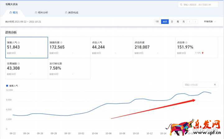打開“生意參謀-市場-搜索分析”,輸入“毛呢大衣女”,查看30天的數據