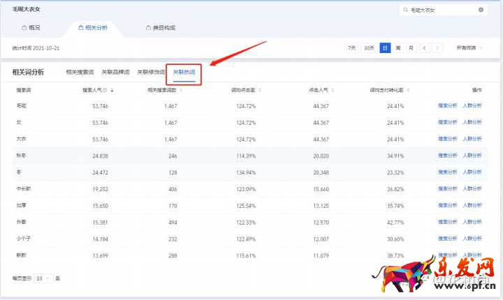 接著,我們點開“相關分析”,看看“毛呢大衣女”中,哪些關鍵詞更有“市場需求力”。