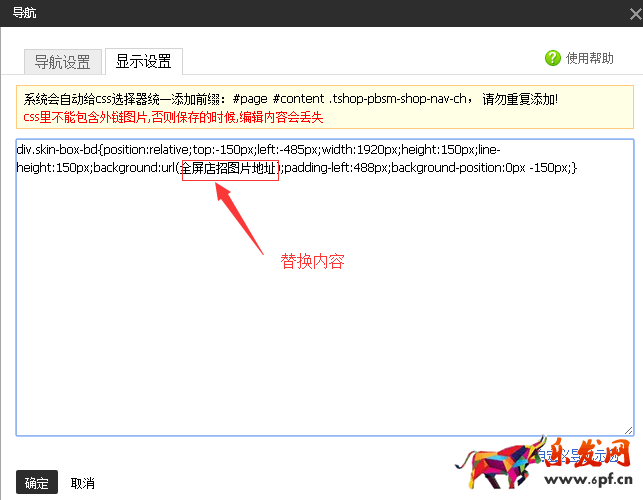 復制圖片以后將上面的導航CSS代碼裝到導航CSS編輯框里,然后將上面復制的圖片地址替換掉“全屏店招圖片地址”文字,發布即可看到效果。