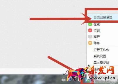 2.鼠標移動到電腦任務欄中的千牛圖標,并右鍵點擊,選擇“自動回復設置”并進入;