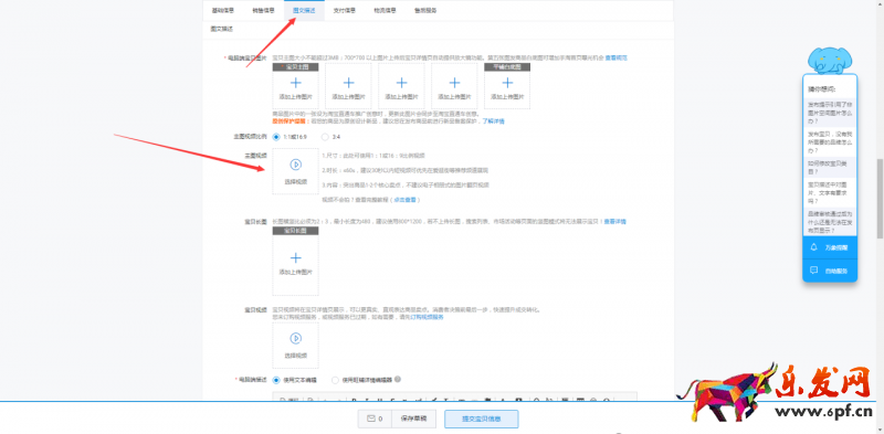 進(jìn)入寶貝發(fā)布后臺以后,在【圖文描述】,【主圖視頻】這個(gè)位置就可以上傳主圖視頻